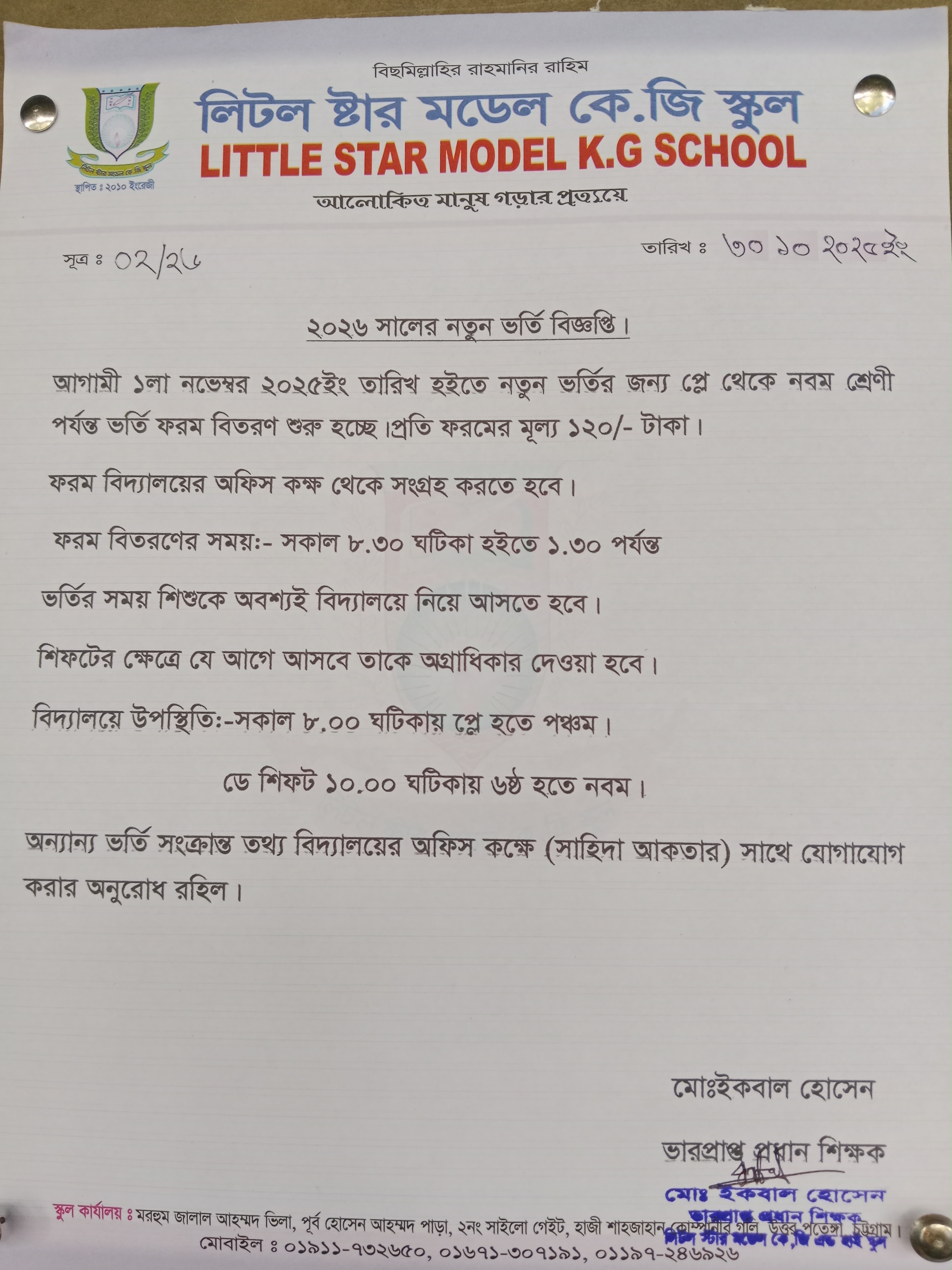 আসছে নতুন শিক্ষাবর্ষে আপনার সন্তানের সু-শিক্ষা নিয়ে আপনি নিশ্চয়ই চিন্তিত। ভাবছেন কোন স্কুলে আপনার প্রিয় সন্তানকে ভর্তি করাবেন? আপনার সকল চিন্তা দূর করতে উত্তর পতেঙ্গা হোসেন আহমদ পাড়ায় লিটল স্টার মডেল কে.জি এন্ড হাই স্কুলে স্কুলের অগ্রযাত্রা।